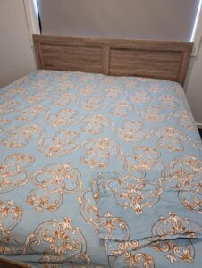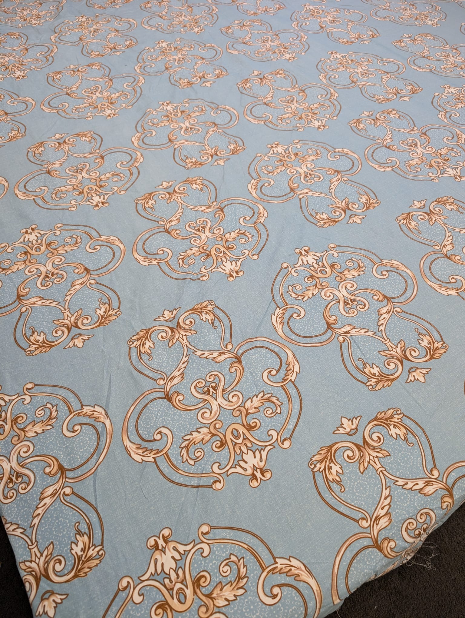 3 piece cotton king fitted sheet set including 1 fitted sheet + 2 pillow covers with very beautiful minimalist floral design in golden color on beautiful light blue base and beautiful matching pillow covers