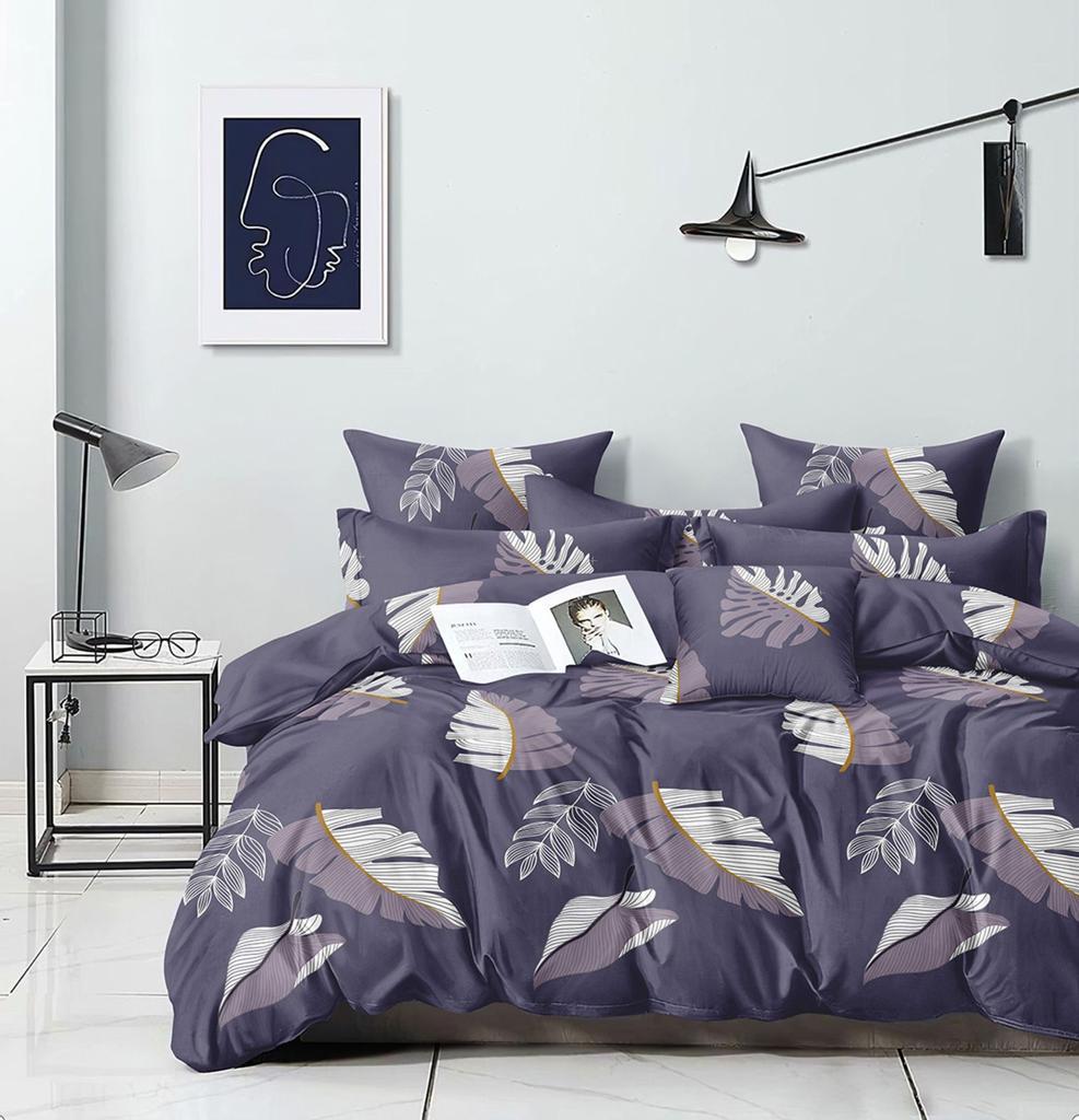 3 piece cotton queen fitted sheet set including 1 fitted sheet + 2 pillow covers with very beautiful minimalist leaf design with the blend of different shades of white and lavender and beautiful leaf print pillow covers