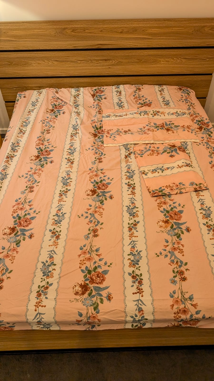 3 piece cotton queen fitted sheet set including 1 fitted sheet + 2 pillow covers with very beautiful minimalist floral design with the blend of different shades of colors on peachy pink base and beautiful floral matching pillow covers