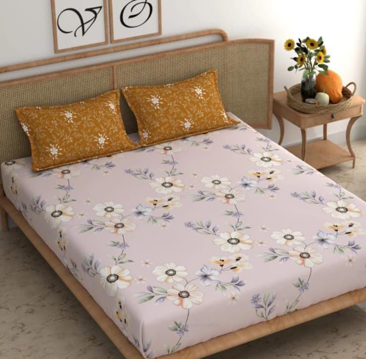3 piece cotton king fitted sheet set including 1 fitted sheet + 2 pillow covers with beautiful floral design on baby pink base and beautiful floral mustard pillows