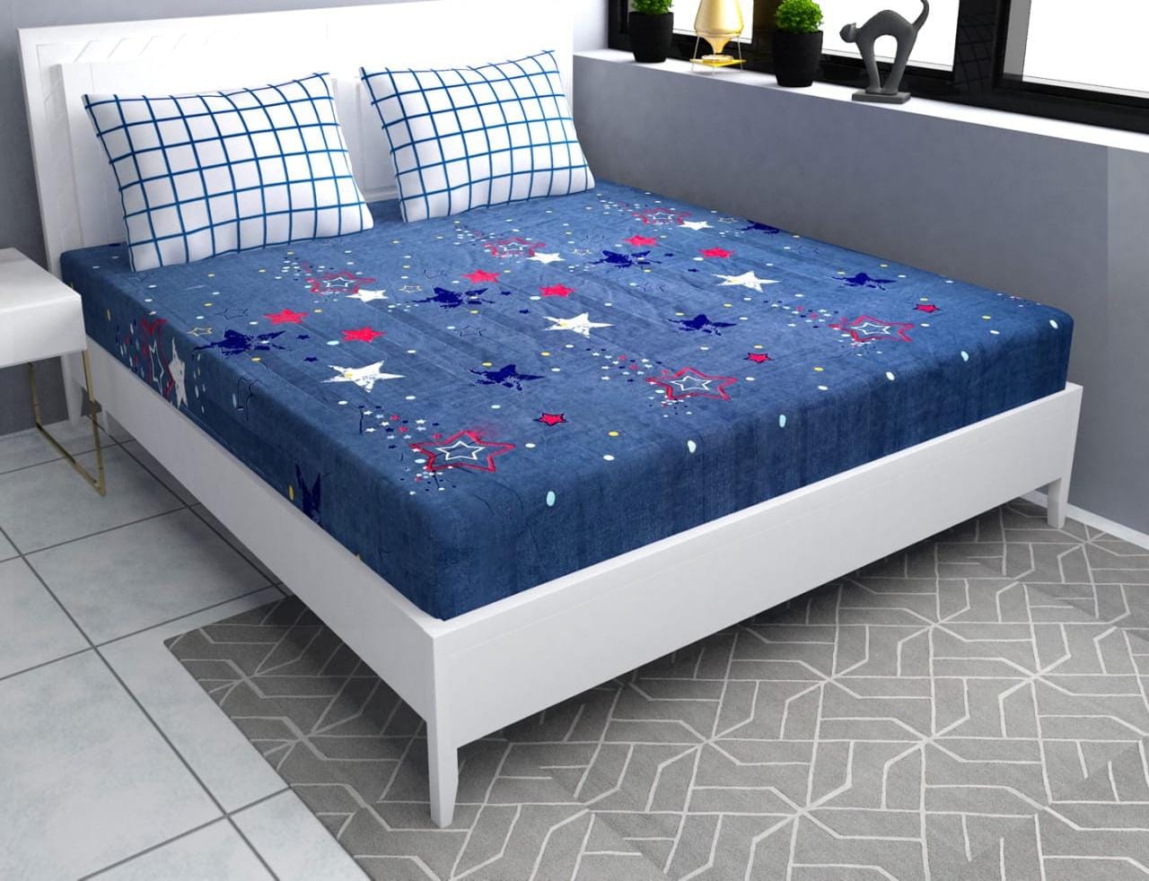 3 piece cotton king fitted sheet set including 1 fitted sheet + 2 pillow covers with beautiful galaxy design on dark blue base with beautiful white check pillow covers